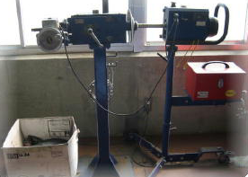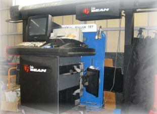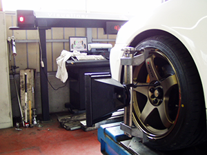 四輪のタイヤのアラメントを測定・調整する機材です。今までのテスターと違い、赤外線により3次元に測定する為、アタッチメント装着から測定までの時間が短縮でき、正確です。